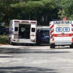 A female paramedic in a reflective vest stands beside a yellow ambulance at night.